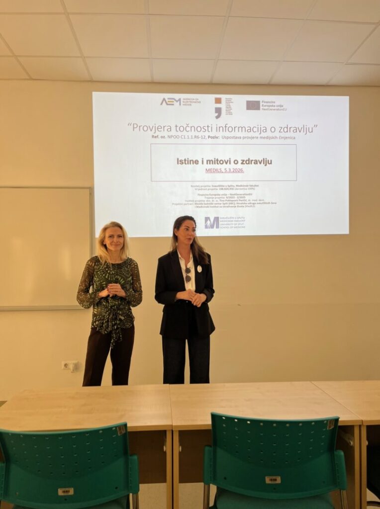 U okviru edukacijskih aktivnosti EU projekta Provjera točnosti informacija o zdravlju Medicinskog fakulteta Sveučilišta u Splitu, 12 učenika četvrtih i petih razreda Zdravstvene škole su s nastavnicama Katijom Biskupović dr. med. i Petrom Ognjenović, prof. psihologije dana 5. ožujka 2026. godine posjetili Mediteranski institut za istraživanje života u Splitu (MedILS) gdje je održan niz predavanja o kritičkom razmišljanju o informacijama o zdravlju, izvorima pouzdanih dokaza, infodemiji i izazovima u raspoznavanju dezinformacija, misinformacija itd.. Predavanja su vodile. doc. dr. sc. Tina Poklepović Peričić, dr. med. dent., dr. sc. Danira Matijaca, mag. educ. phys. et polytechn., mag. bibl., voditeljica knjižnice Medicinskog fakulteta u Splitu i dr. sc. Andrea Gelemanović, mag. biol. mol. uz dobrodošlicu domaćina na MedILS-u, Anjom Šuta mag. philol. croat.
