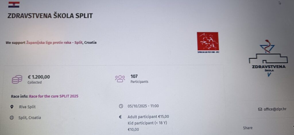 Skupina od 60ak učenika (1.b, 1.d, 2.b, 2.c, 4.a, 4.b, 4.e, 4.g i 5.c) i nekolicina nastavnika naše škole u timu Zdravstvena škola pridružila se šetnji/trci, unatoč lošem vremenu, dajući na taj način podršku svim postavljenim ciljevima ove akcije prije svega slaveći život i pozivajući žene na preventivne preglede.