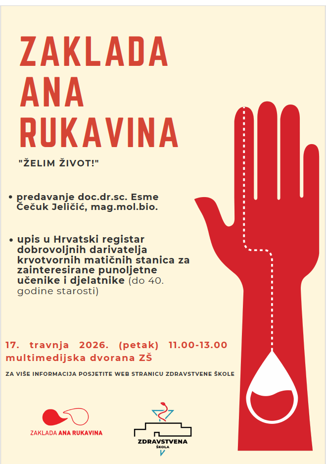I ove godine organiziramo upis u Hrvatski registar dobrovoljnih darivatelja krvotvornih matičnih stanica u suradnji sa Zakladom Ana Rukavina. Akcija će biti 17.4. (petak) u 11.00 do 13.00 u multimedijskoj dvorani Zdravstvene škole.