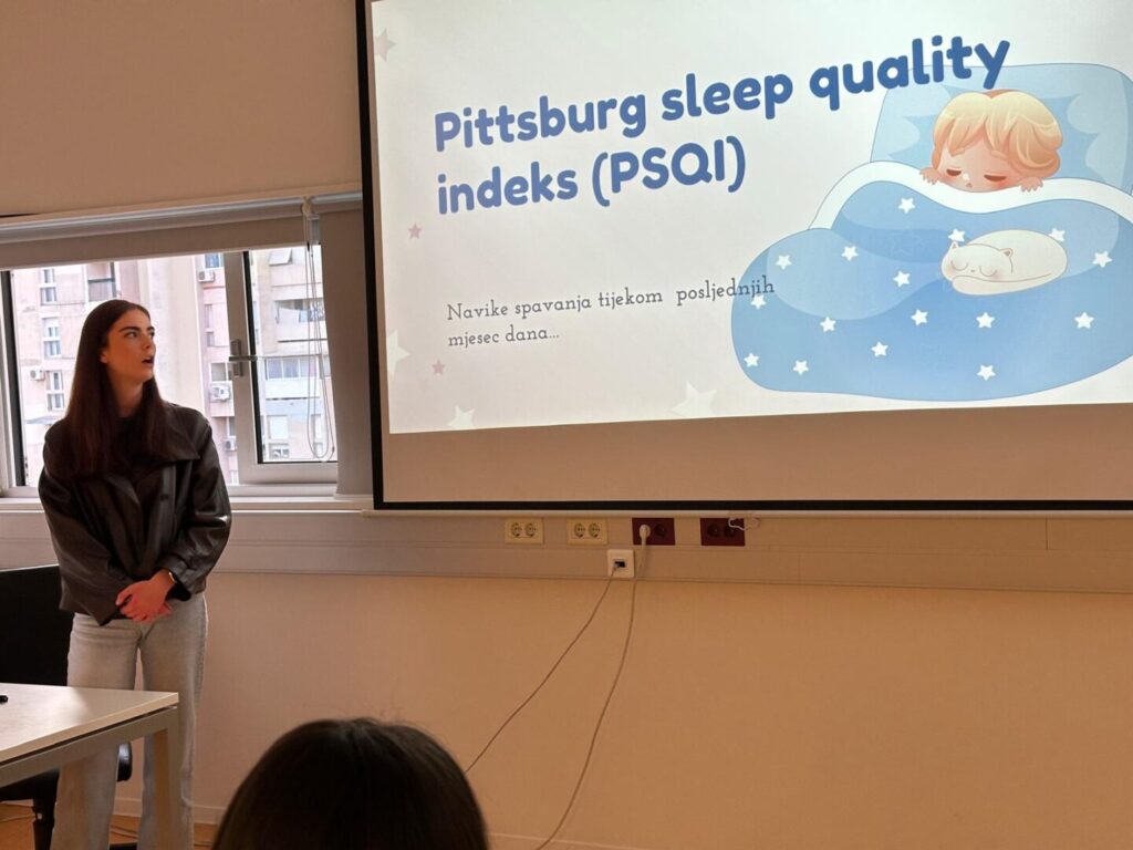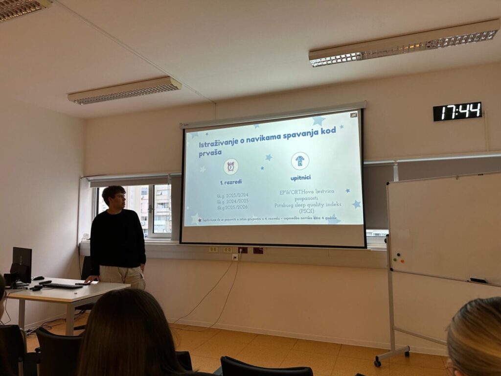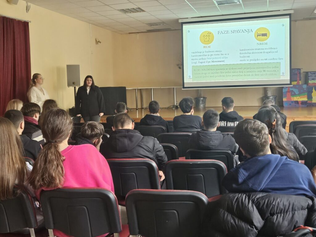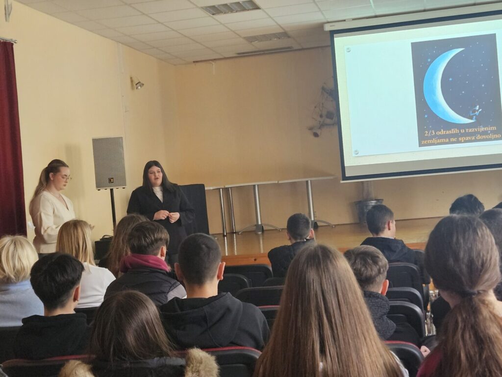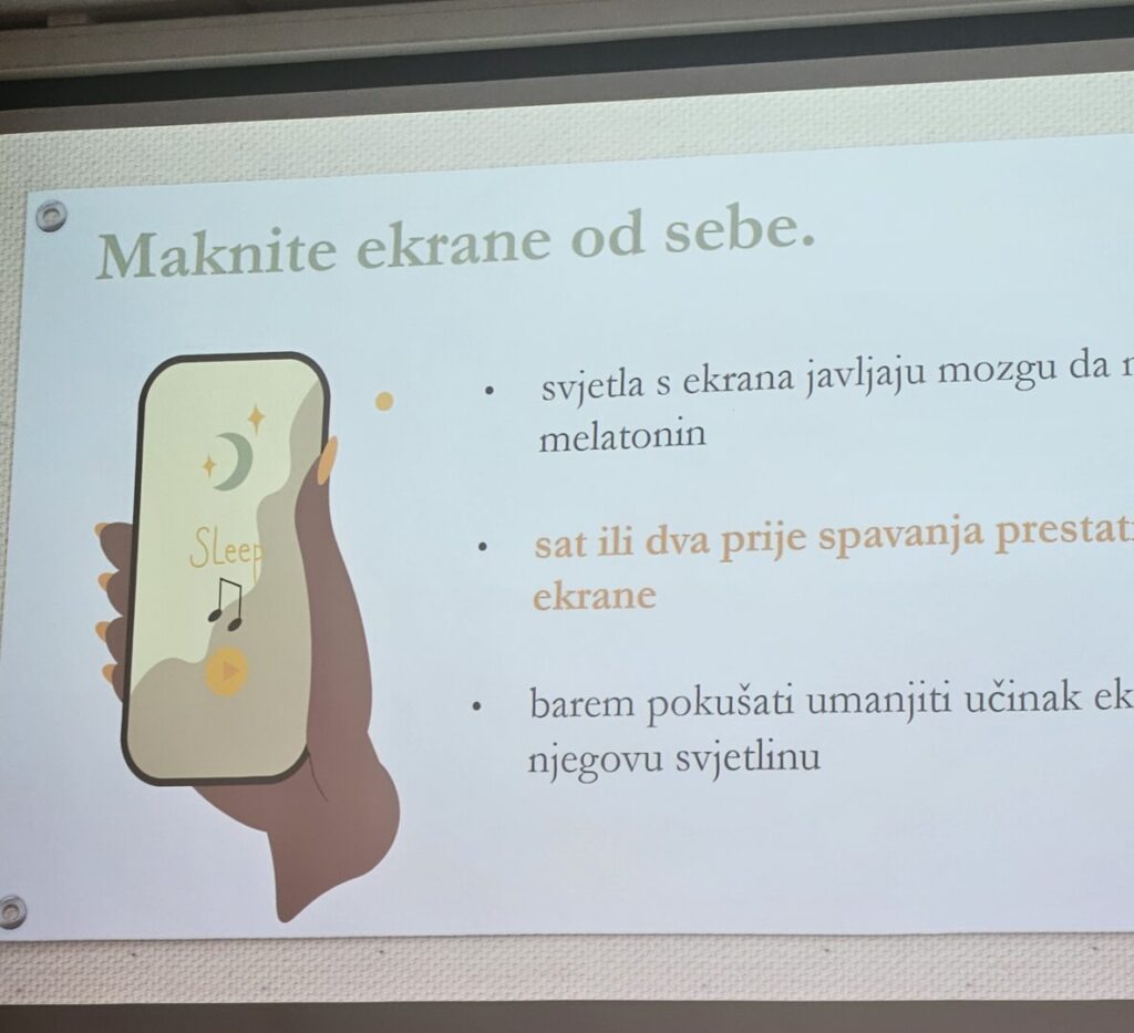 Nakon toga su učenice Laura Bulić i Lana Kušeta, učenice 4.d razreda objasnile fiziologiju spavanja, REM i NREM faze spavanja i pojam higijene spavanja te predstavile preporuke za kvalitetno spavanje.