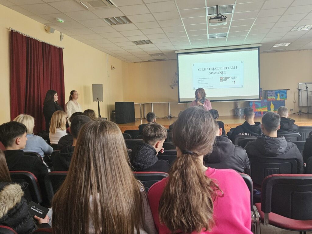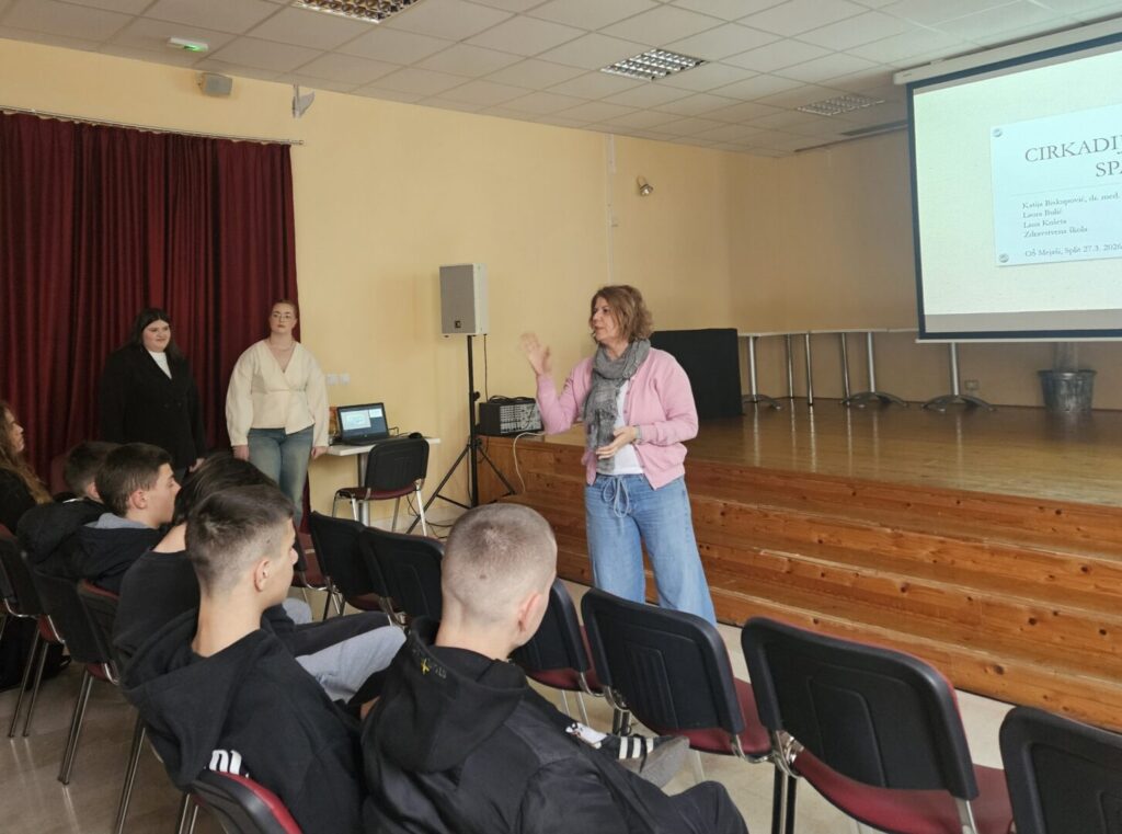U osnovnoj školi Mejaši u Splitu dana 29.3.2026. 13.00 održali smo predavanje “Cirkadijalni ritam i spavanje” za sve osme razrede škole. Bilo je prisutno 50ak učenika u pratnji nastavnica iz biologije Marite Čalete.